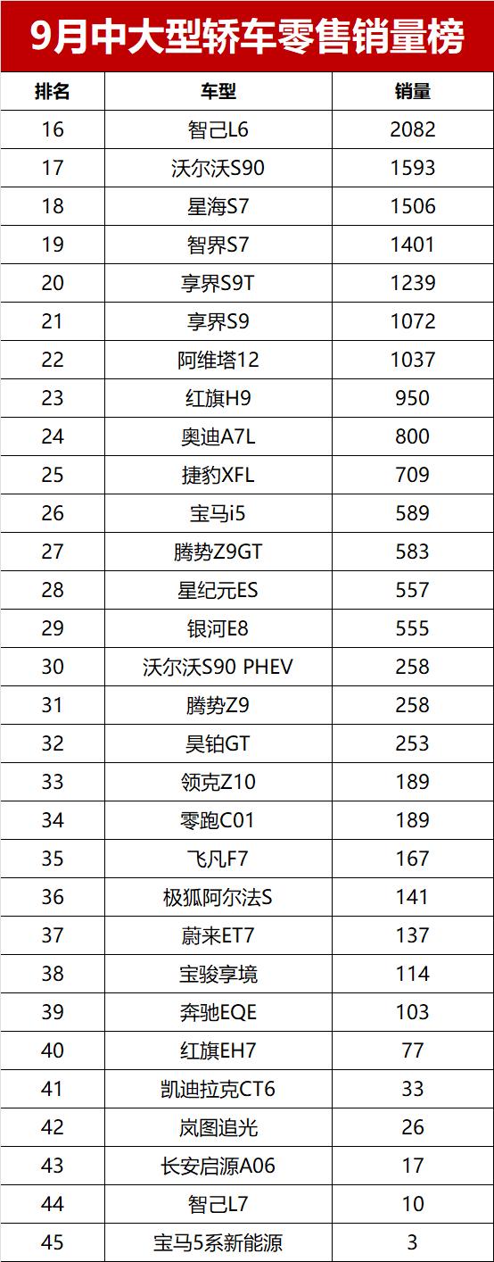 自主燃油及新能源多元化车型共同发力,丰富了市场选择。红旗H9作为自主豪华代表,9月销量达950辆,较上月的613辆实现增长,排名第二十三位。eπ007和智己L6分别以2106辆和2082辆的销量排名第十五和十六位,持续深耕年轻消费群体。腾势Z9GT和腾势Z9分别以583辆和258辆的销量进入榜单,完善了自主豪华新能源的产品矩阵。零跑C01、飞凡F7等车型也均有稳定销量贡献,展现出自主品牌在中大型轿车市场的全面竞争力。