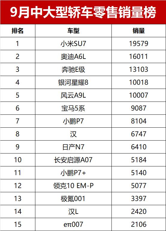 具体来看,头部车型竞争态势稳定,小米SU7以19579辆的销量成功卫冕冠军,尽管较8月的19848辆略有回落,但仍以绝对优势领跑市场。奥迪A6L表现强势,9月销量达到16011辆,较上月的12941辆大幅增长,排名跃升至第二位,成为豪华燃油车型的销量标杆。奔驰E级紧随其后,凭借13103辆的销量位列第三,较8月的8800辆实现显著提升,展现出豪华品牌的强大市场韧性。银河星耀8和风云A9L分别以10018辆和10007辆的销量跻身前五,成为自主中大型轿车的核心力量。