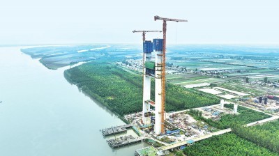 相比上一代造塔机,新一代造塔机“软硬件”大幅迭代升级,其装配速度更快、系统更集成、操控更智慧,由内外顶升平台组成,涵盖了支撑系统、框架系统、模板系统及智能设施,可随索塔主体节段攀升,犹如空中的“智能移动工厂”,其中的智能养护、温控系统,通过埋设测温元件,实现大体积混凝土全自动养护,有效提升施工质效。
